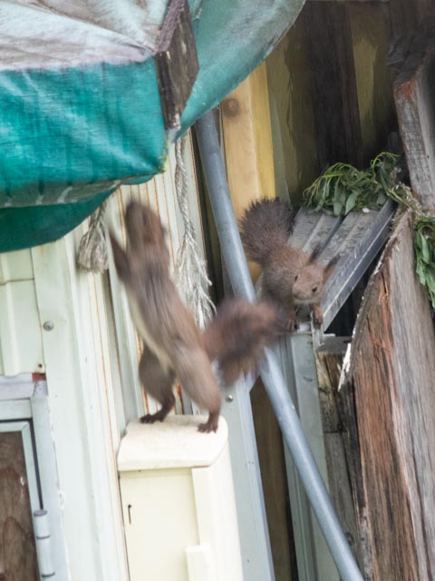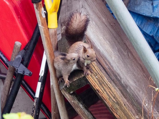 2021年06月01日 撤収 付いておいでとクララが引越し先の屋根裏へ消えていったが仔リスは届かない子が。 この巣を使うには仔リスがまだ幼いような気がする。 パニックになった3兄弟は上へ下への大騒ぎ。 1匹は もと来た道をたどって 古い巣に帰ってしまった。 幼いのに古い巣を認識してること ... カテゴリ : エゾリス , なんちゃっ亭 コメント( 16 )