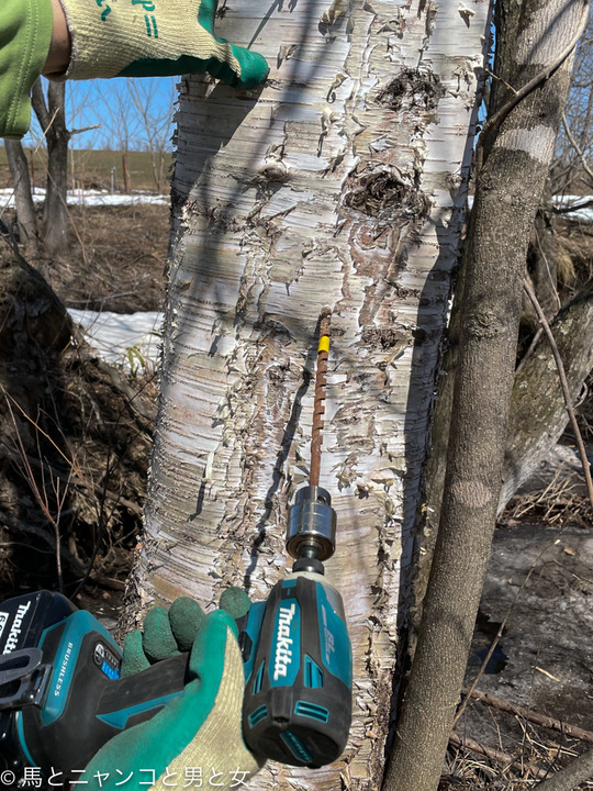 2022年04月09日 白樺樹液 白樺樹液の存在は知ってたけど飲んだことはなかった。 なんちゃっ庭の白樺が太く育ってきたのでネット検索してお試ししてみた。 どっかからもらってきた錆び錆びの木工用ドリルの刃で深さ4cm穴を開け チューブを差し込むだけでタラタラと流れ出てきた。 マイナス気温の夜 ... カテゴリ : 日記 , 猫 コメント( 3 )