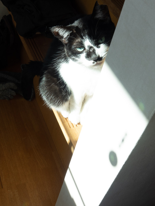 2022年10月30日 保護色 2階の寝室から寝ぼけ眼で階下を伺う。 何かおるな。 保護色を使い階段と同化してる「まっちゃん」。 「踏まないでね。」 とアピールしとるが敢えて軽く踏んでやるのがお約束。 寝起きすぐの階段一段飛ばしはきつい。あのね ひなたぼっこは他所でやるように。 ヾ(ー ... カテゴリ : 猫 コメント( 7 )