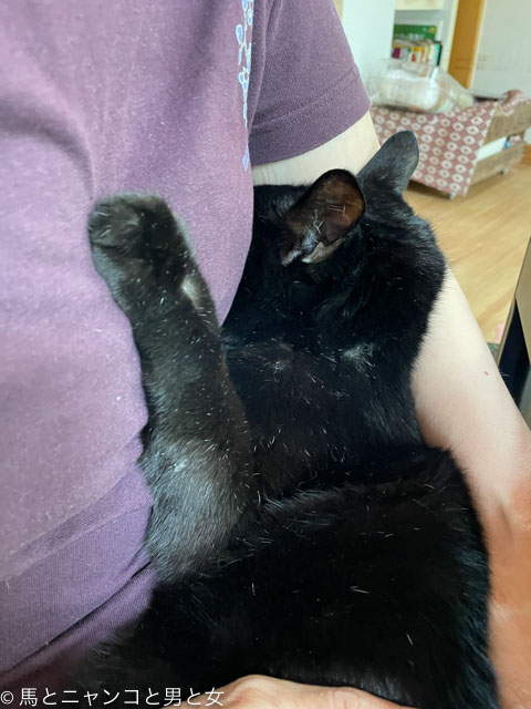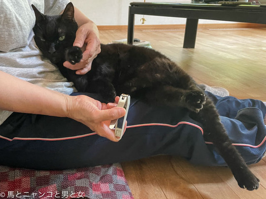 2024年06月12日 パチンパチン 注射が効いたのか 呼吸音は小さくなったようだが食欲はまだ回復途上の「オトじい」。 朝からごはんも食べずに走り回ってたので大丈夫なのではないか と。 甘えてきた所を捕獲され爪切り。 左手をパチンパチン からの 左足パチンパチンされるがまま 見事な切られっぷ ... カテゴリ : 猫 , 馬 コメント( 11 )