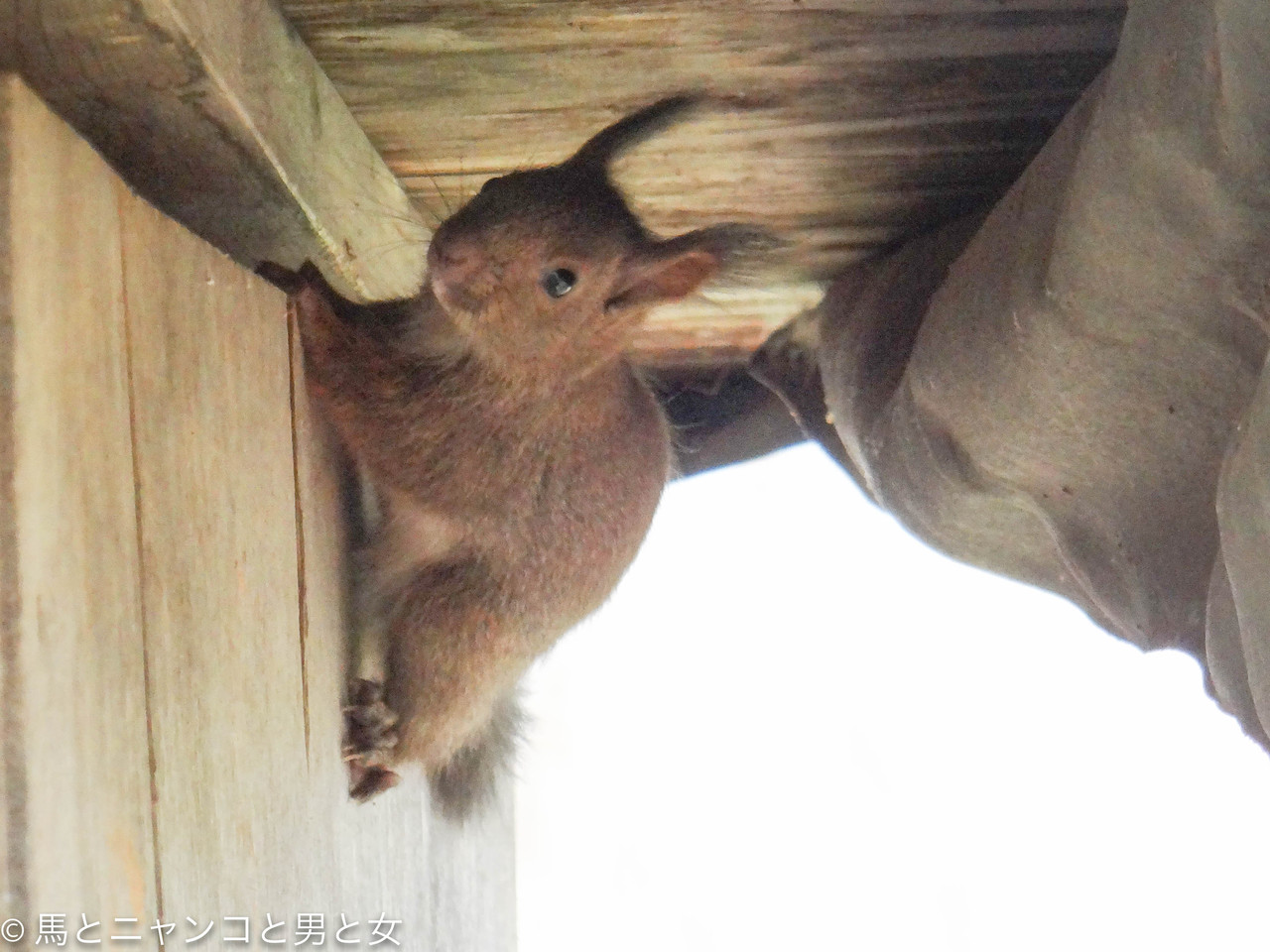 息を殺し 恐る恐る物置を開けたが仔リスに見つかってしまった。