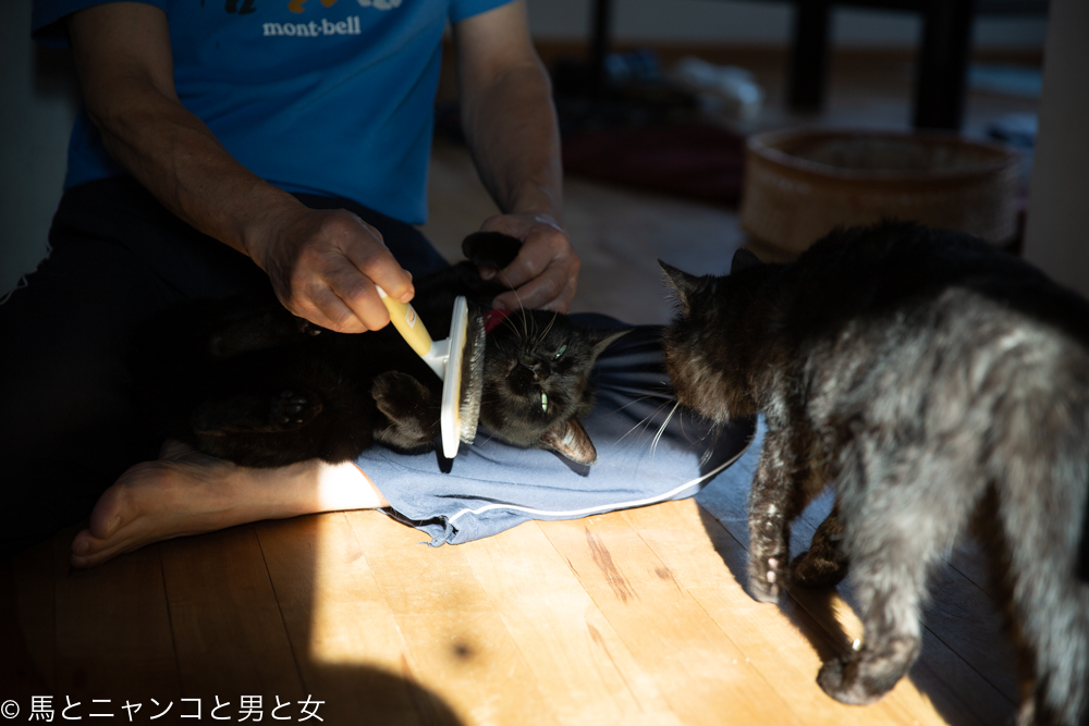腰が痛いのでお姉さん座りでブラッシングするが・・・自分達だけでグルーミングし合うって選択肢はないのか? ヾ(ーー )