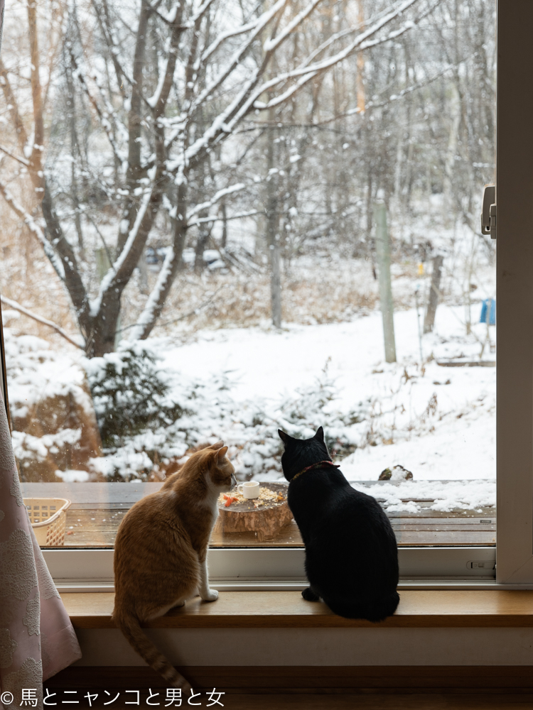 けどクリスマスイブになって帳尻合わせで外は白い景色に。オトまつコンビも昨日までと違う景色を眺めてる。