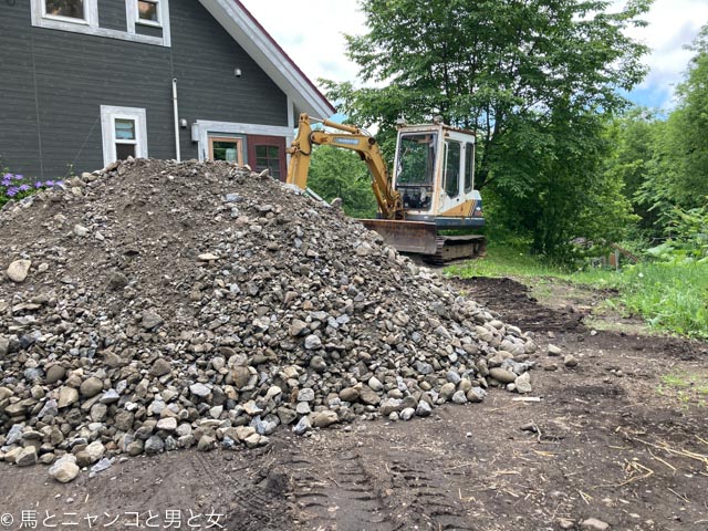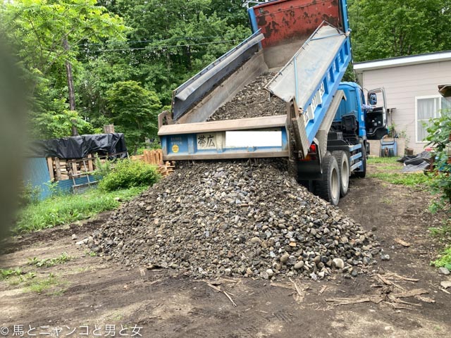 10年以上前に4cm大の砂利を敷いたが踏んで踏んで土に飲み込まれていったみたい。今度は飲み込まれないように8〜10cm大の砂利をダンプカー1台分配達してもらった。