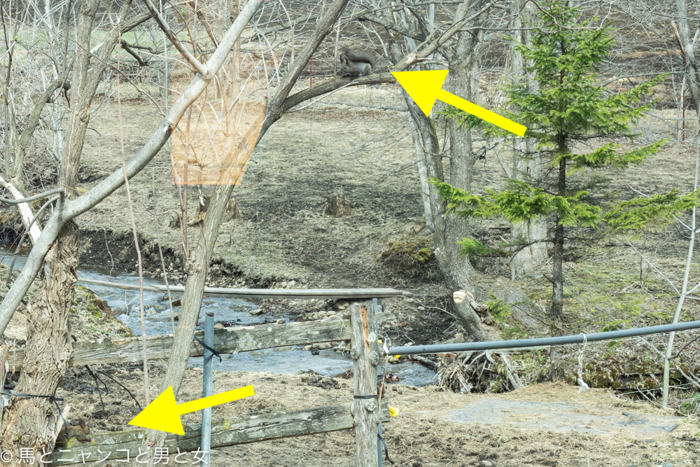 朝 カーテンを開けると久し振りのエゾリスカップル登場。