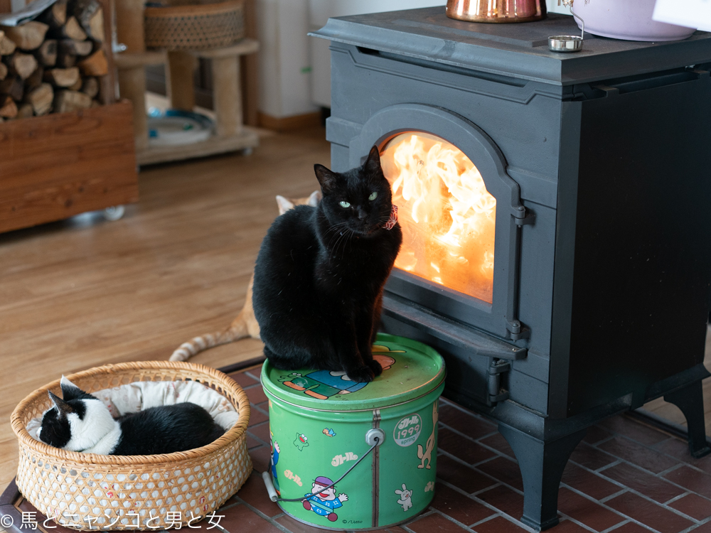 なんちゃっ邸内は温かいはずやけど寒そうにしとるので薪ストーブ点火!