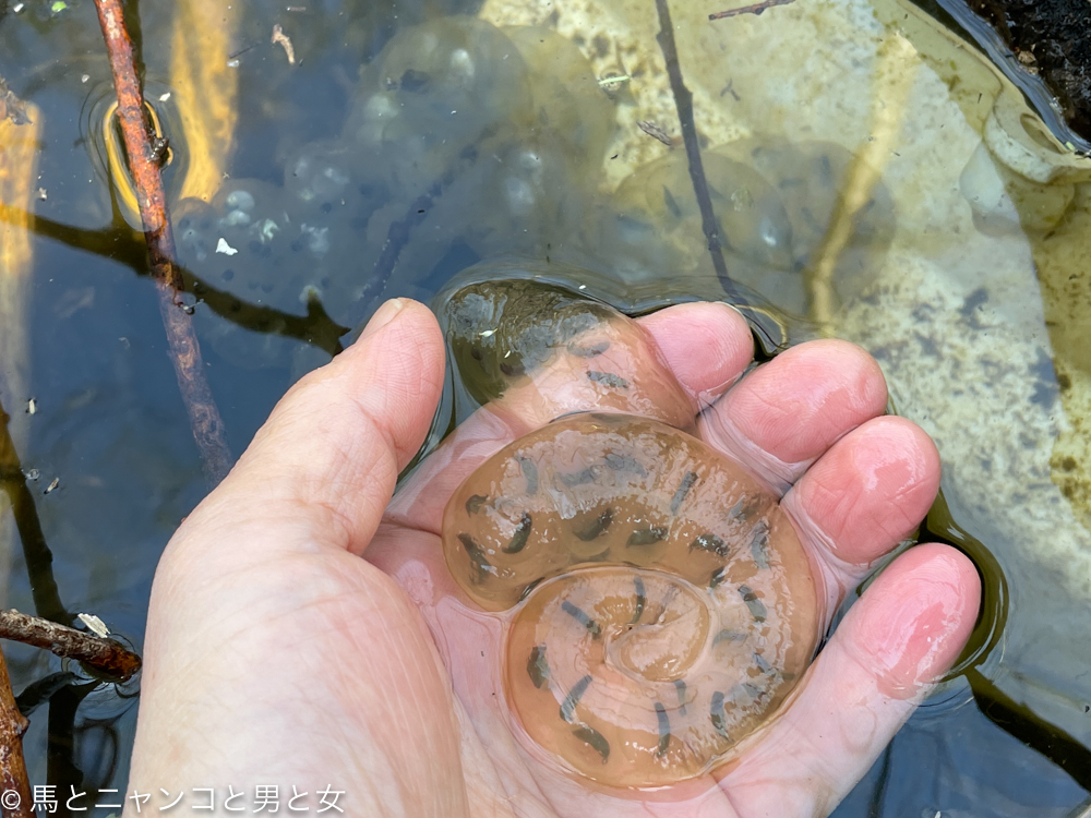 小さく生んで寒天質が水を吸って大きく膨らむようになってる みなさん個室で育ってはります。餌となるおたまじゃくしを確認してから孵化するんやろか?