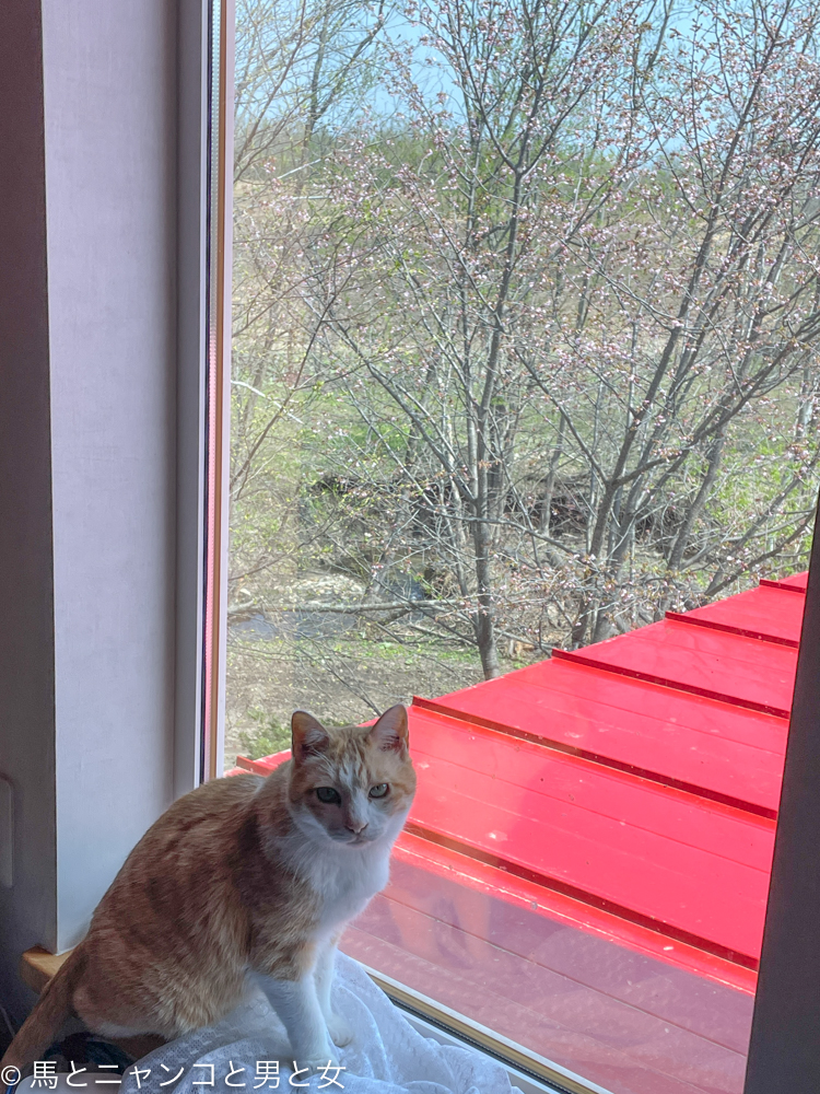 「まっちゃん」が2階の窓からエゾヤマザクラの開花宣言!