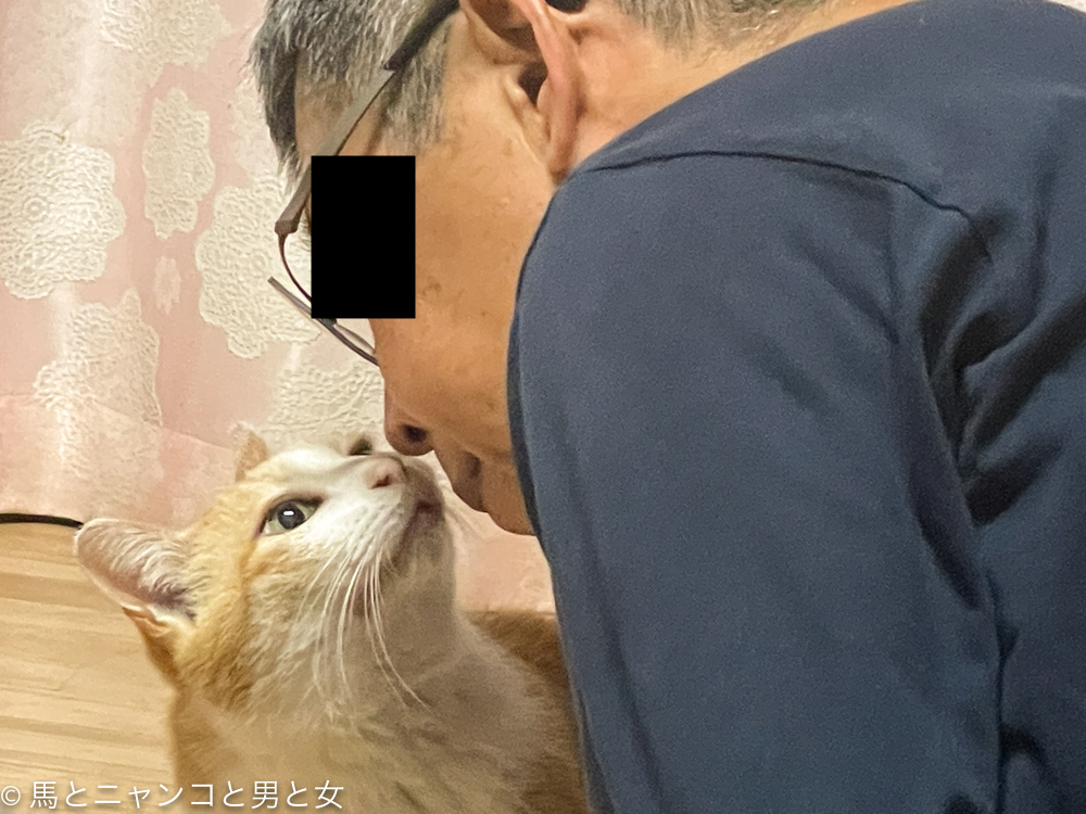違うねん 前屈してストレッチしてただけやねん。茶白の坊っちゃんが近づいてきて口臭チェック?