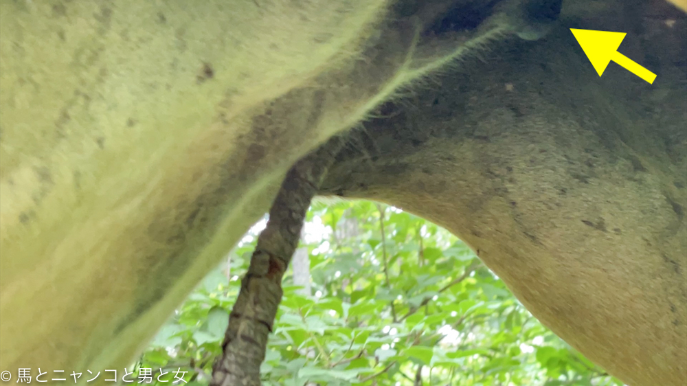 枝を痒いところに当てて前後に動いてはります。(黃矢印は乳首)馬が「孫の手」みたいに枝を使うってなかなか賢い。