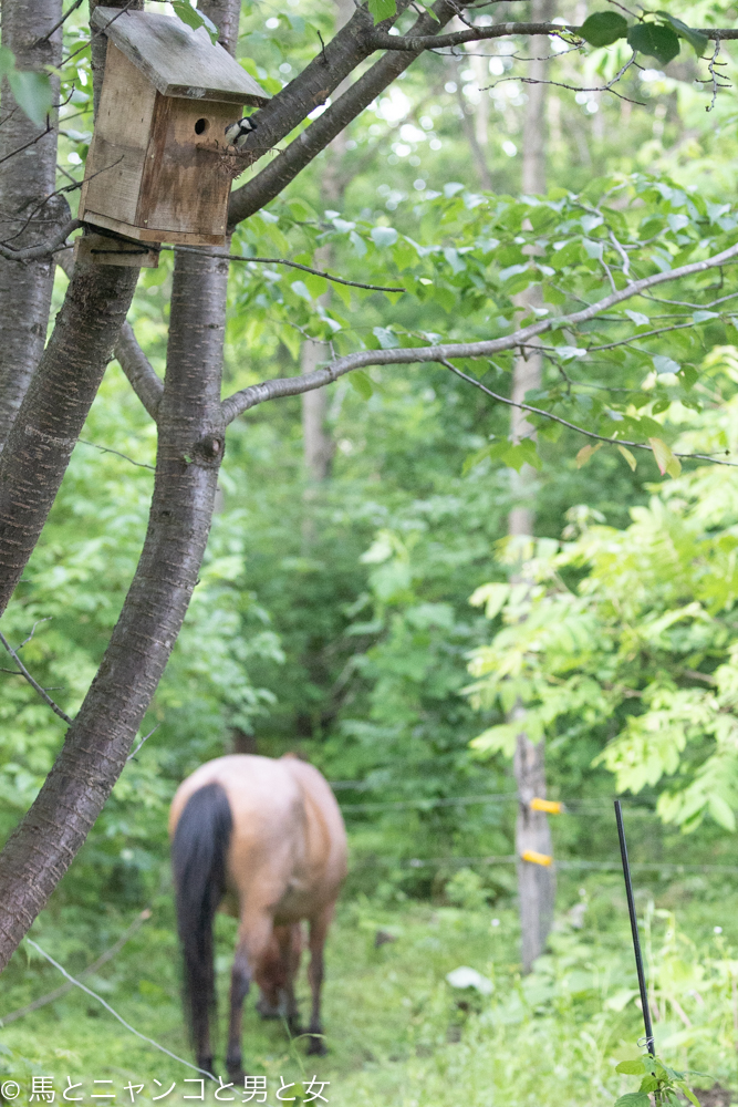 マーボーの後方に映る巣箱。