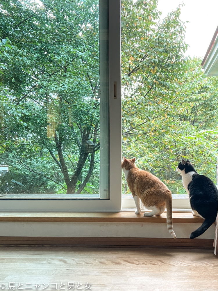 網戸にしたら雨上がりで湿度たっぷりの外気を吸うマーボー&「まっちゃん」。今夏暑すぎて桜の葉がアチコチ黄色く変色して散っていってる。