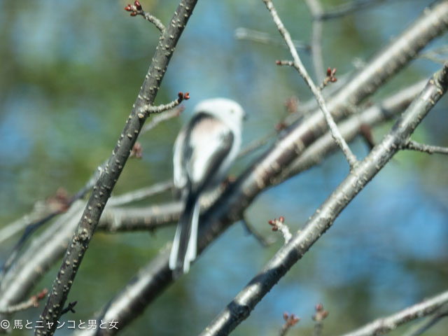 手前の桜の枝にピントぴったし シマエナガの目が点になってて大笑い。