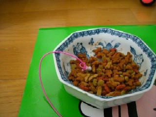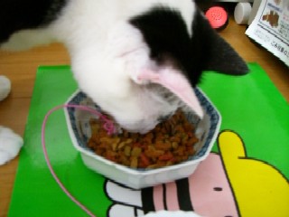 このにゃんこ、カワイイなあ~。オモチャをおかずにして、ごはんを食べてるんですね。