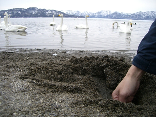 カヌーを満喫した御一行は屈斜路湖の砂湯へ。