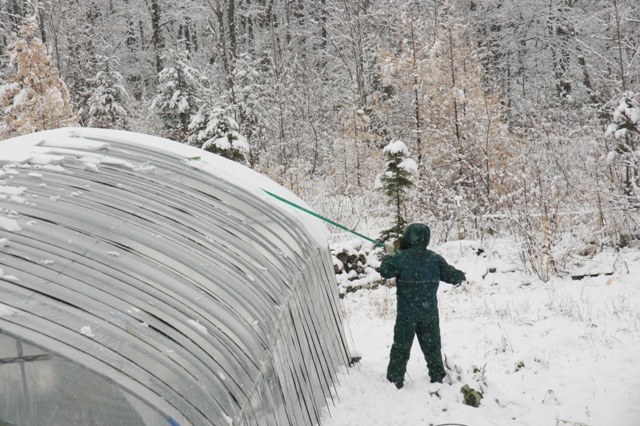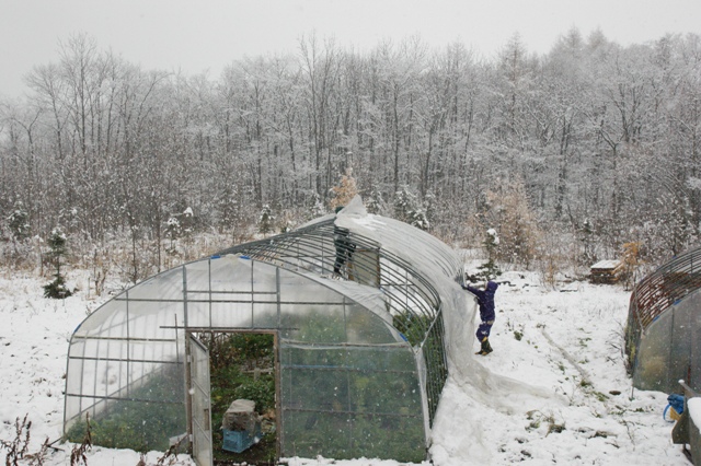 2時間経っても雪が止まないのでハウスのビニールを剥がすことにした。