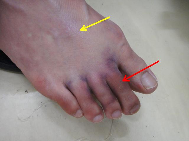 気を付けていたはずだったが 先週 角材を足の甲に落としてしまった。