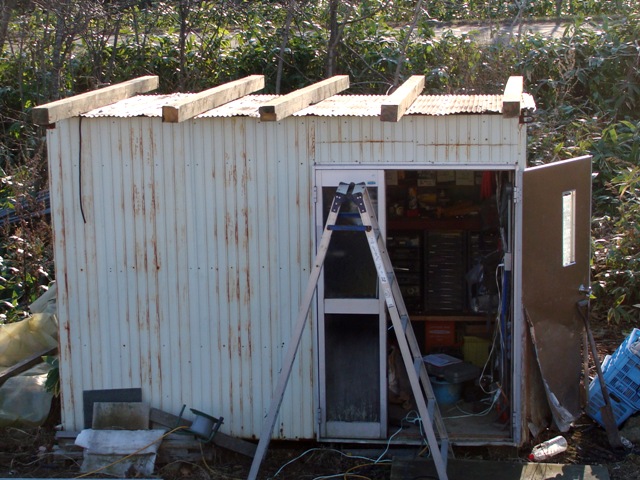 屋根にシートを張って 棚を作って 溢れる廃材を整理してみた。