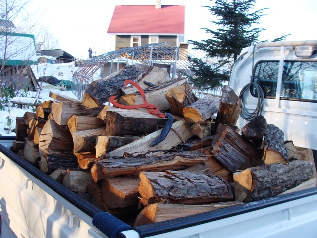 寒いけど仕方なく軽トラで3往復して家の横の薪棚に並べた。