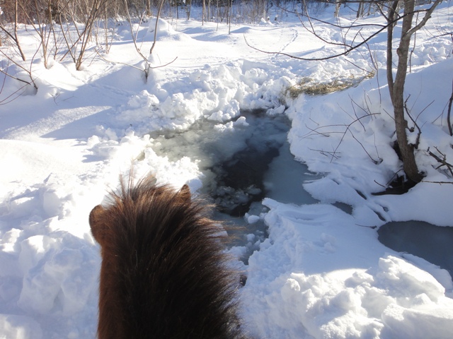 「マロンちゃん大丈夫 ちと冷たいけど君なら渡れる。」と 長靴をはいて