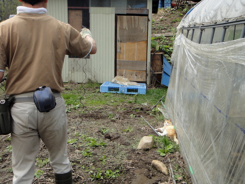 「ビニール引っ張り上げていて 何か重たいと思ったら もたれかかっとるやないかっ!」