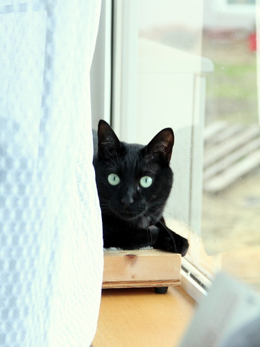 朝 窓際でカーテンに隠れてポツンと外を眺めるオトスケの姿。