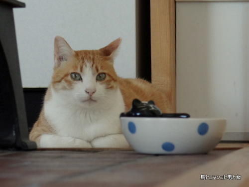 さて、こちらのニャンコはごはん皿を前にして何でしょう?