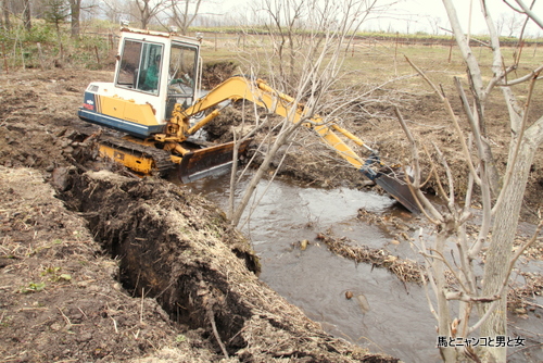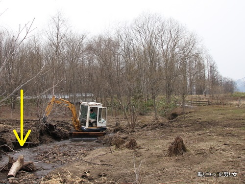 このままでは馬小屋が危ない。 バックホーで沢の流れを変えてみる。