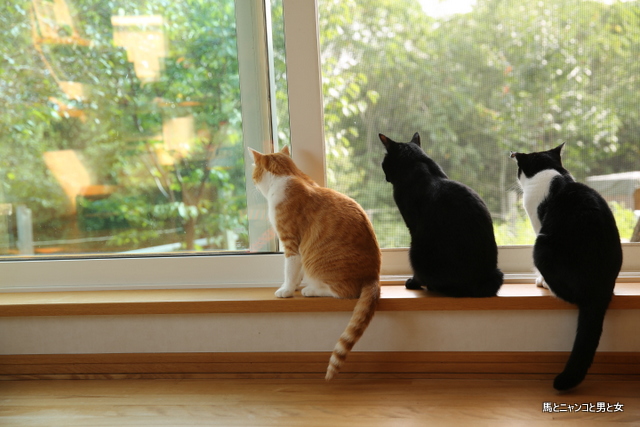 並んで小鳥を目で追う 左から「まっちゃん」・オトスケ&マーボー。