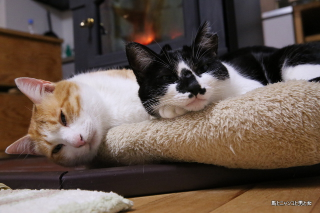 一方、ストーブ前でウトウトと寝落ちるまっちゃん、至福ですよね・隣にマー坊姫いるし。彼女はこれまた瞼が怪しいけど・まだ瞳ある〜ね?