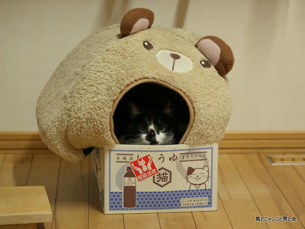 クマちゃんベッドと、猫印マタタビ入り醤油爪とぎ箱の二重使い?
