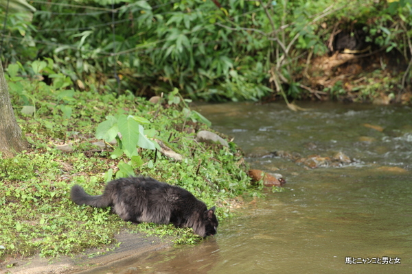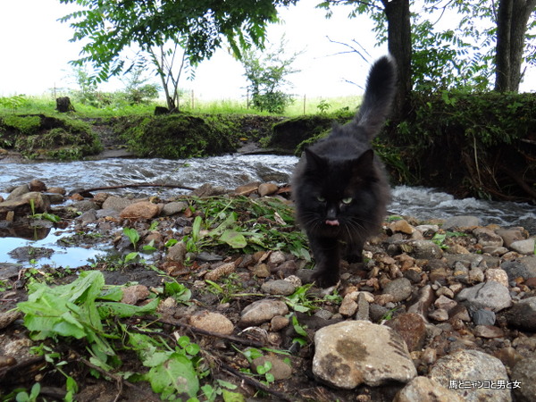 沢の水が増水して少し濁っているので大丈夫か? と 味見する黒猫王子。